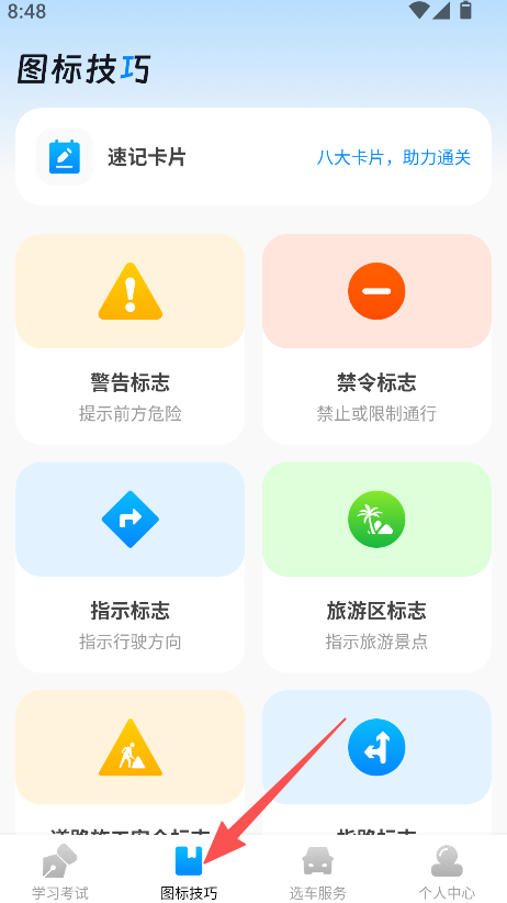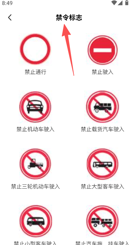 1、进入图标技巧,选择禁令标志等分类,学习交通标志含义。