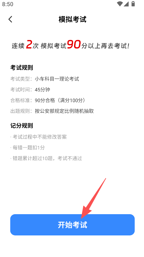 2、进入模拟考试,查看考试规则(如考试时间、合格标准)。