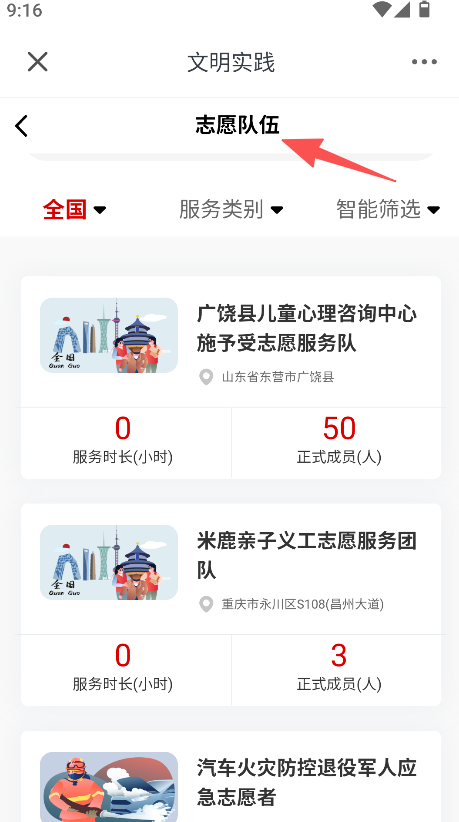 1、进入志愿队伍,浏览全国志愿队伍列表。
