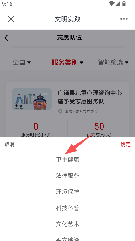 2、提供筛选功能,可按服务类别(卫生健康等)、区域等筛选志愿队伍,精准查找目标队伍。