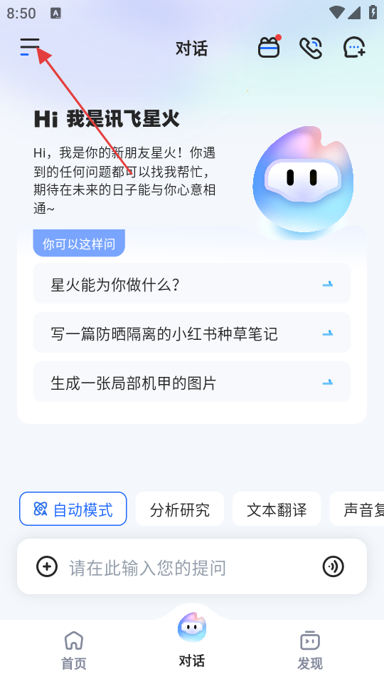 1、在对话页面,点击左上角的三条横线图标,展开侧边栏。