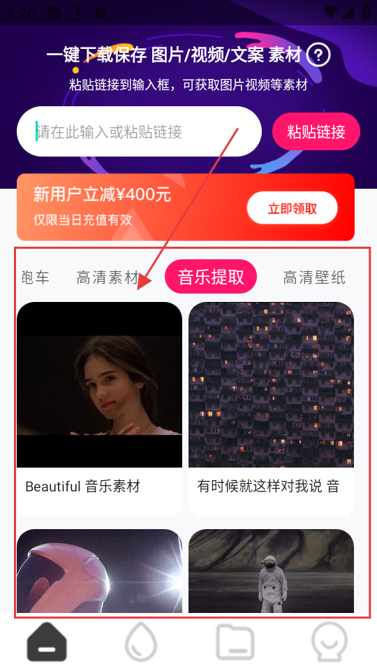 3、在素材页面,点击【音乐提取】,可浏览音乐素材,选择喜欢的音乐素材查看啦。