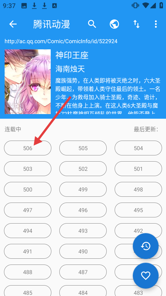 4、在漫画详情页,点击章节按钮,如【506】,即可开始阅读对应章节。