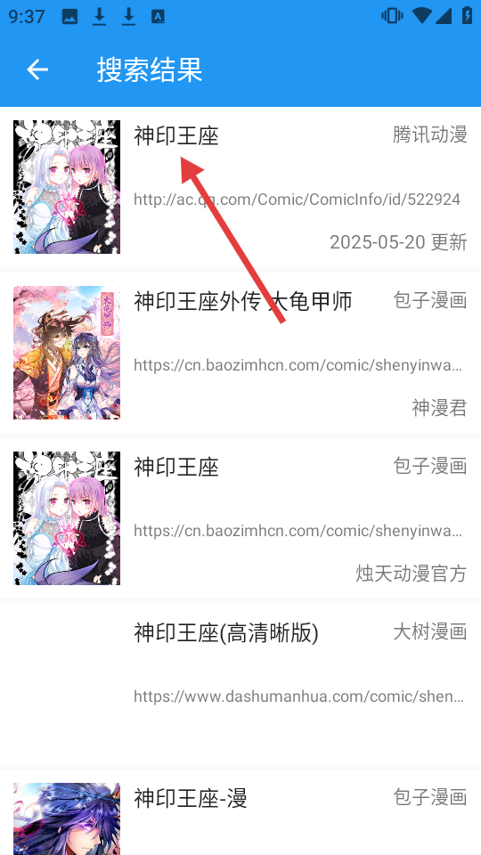 3、在搜索结果中,点击目标漫画条目,如【神印王座】,进入漫画详情页。