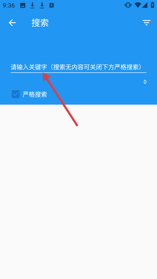 2、在搜索页面的【请输入关键字(搜索无内容可关闭下方严格搜索)】输入框中,输入想要查找的漫画关键字。