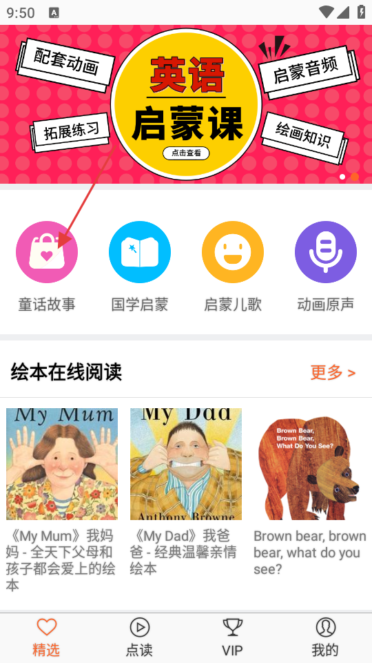 1、在软件精选页面,点击【童话故事】选项,进入童话故事列表页面。