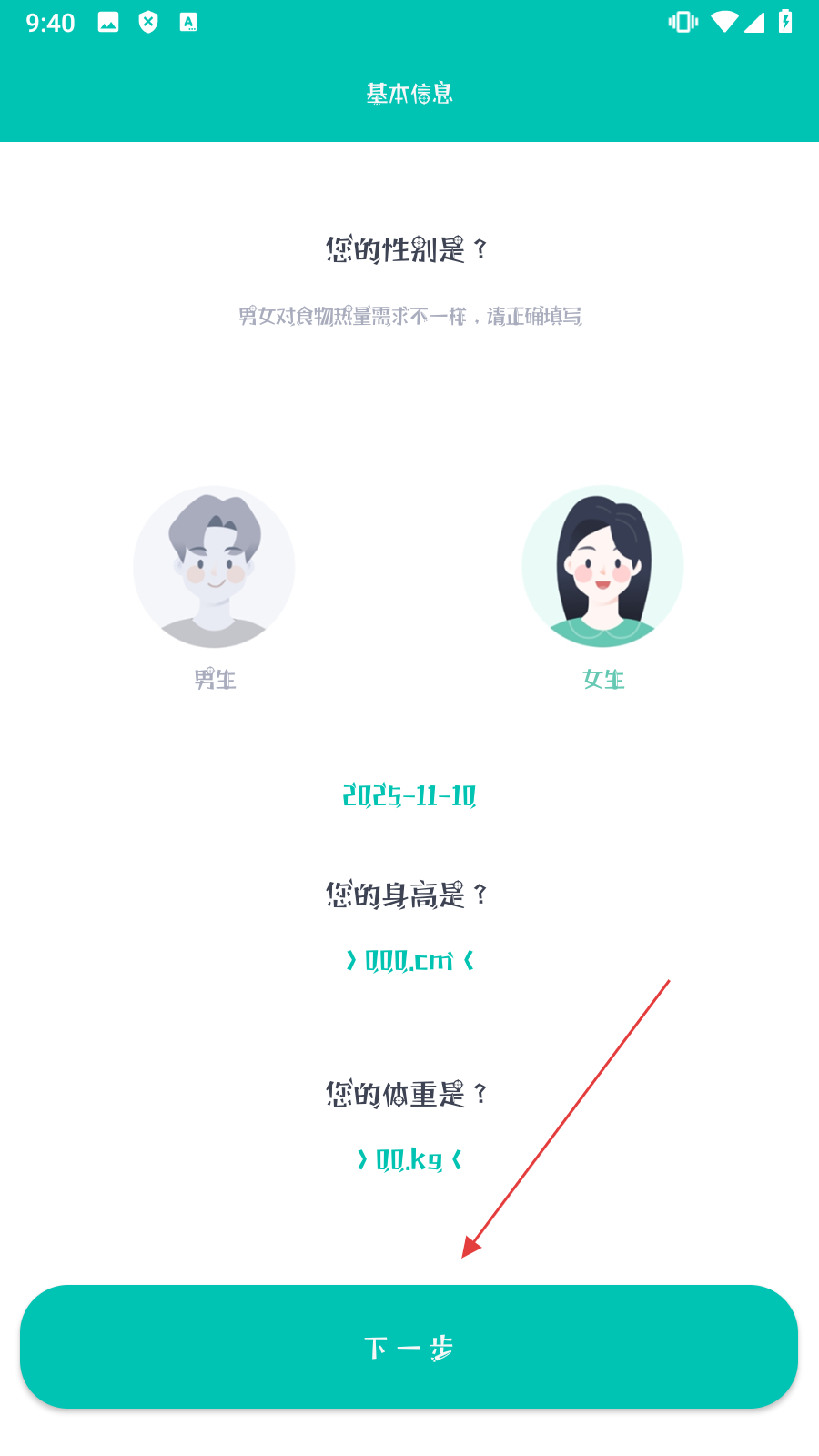 1、填写性别、身高、体重后,点击【下一步】,进入登录注册页面。