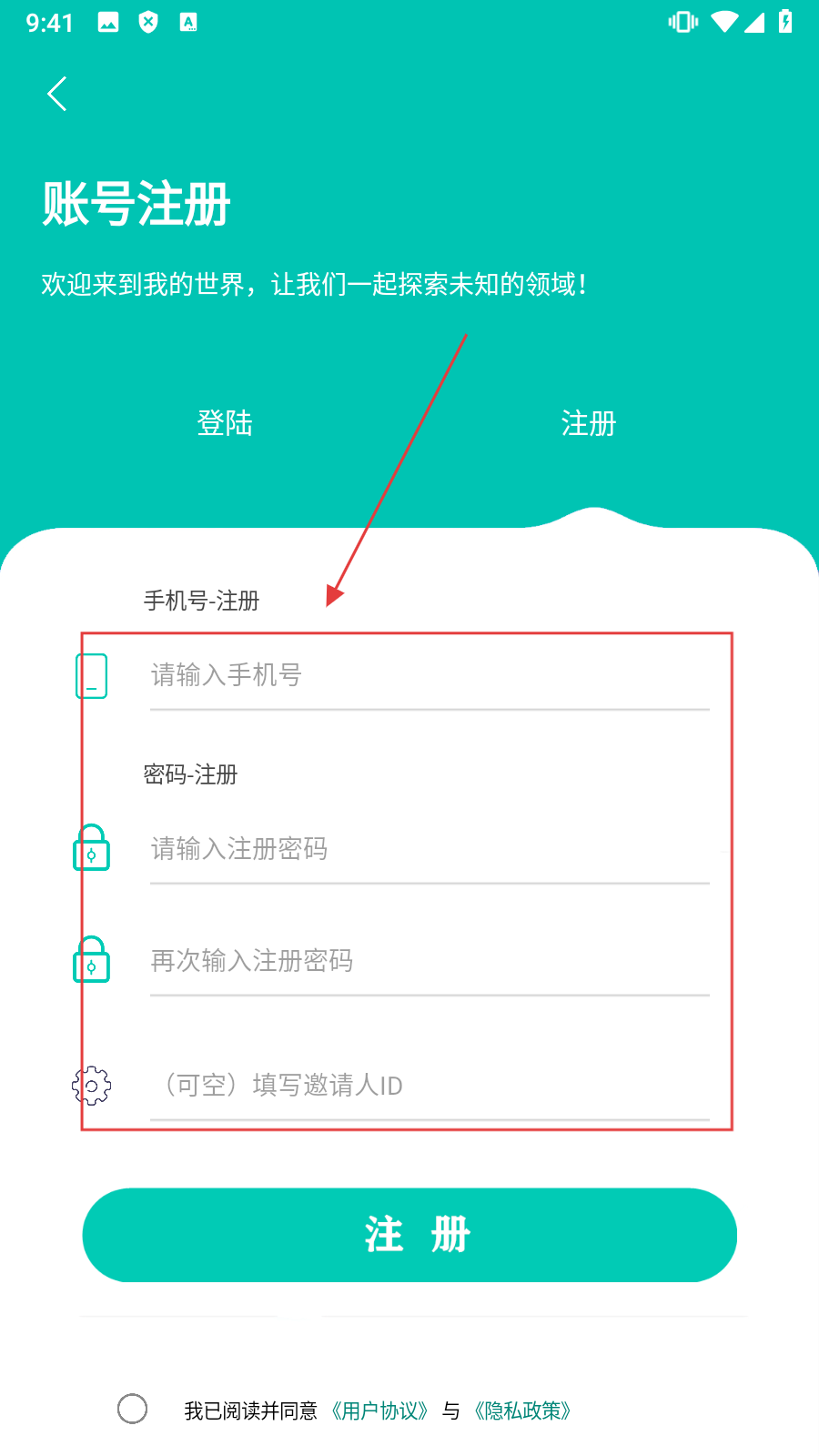 3、在页面中填写【手机号、密码等注册信息】,准备注册账号。