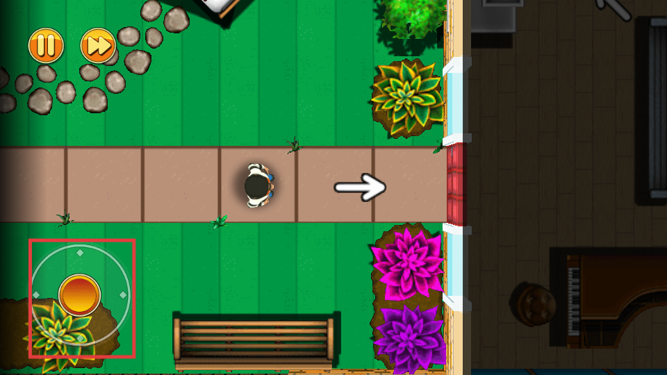 1、使用左侧虚拟摇杆移动角色,沿着箭头方向前进,探索游戏场景。