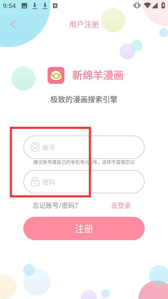 4、在用户注册页面,在【账号】和【密码】输入框中填写信息,完成注册流程。