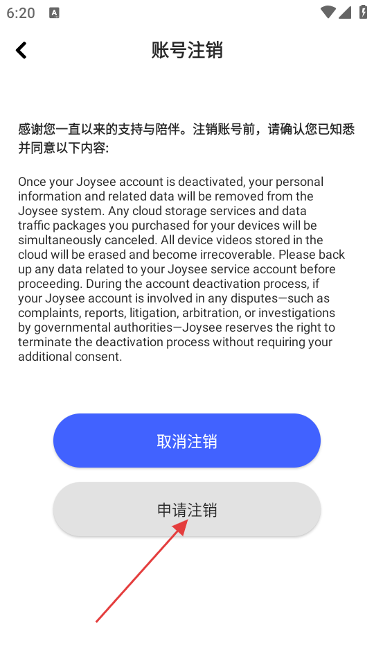4、在账号注销页面阅读相关说明后,点击【申请注销】按钮即可发起账号注销流程。