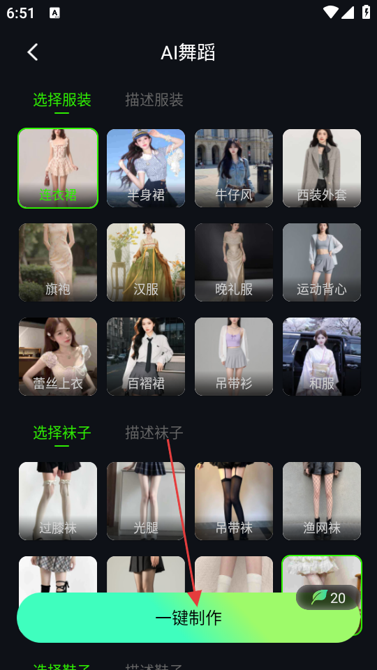 4、在创作页面选择服装、袜子等元素后,点击【一键制作】按钮,即可生成同款舞蹈作品。
