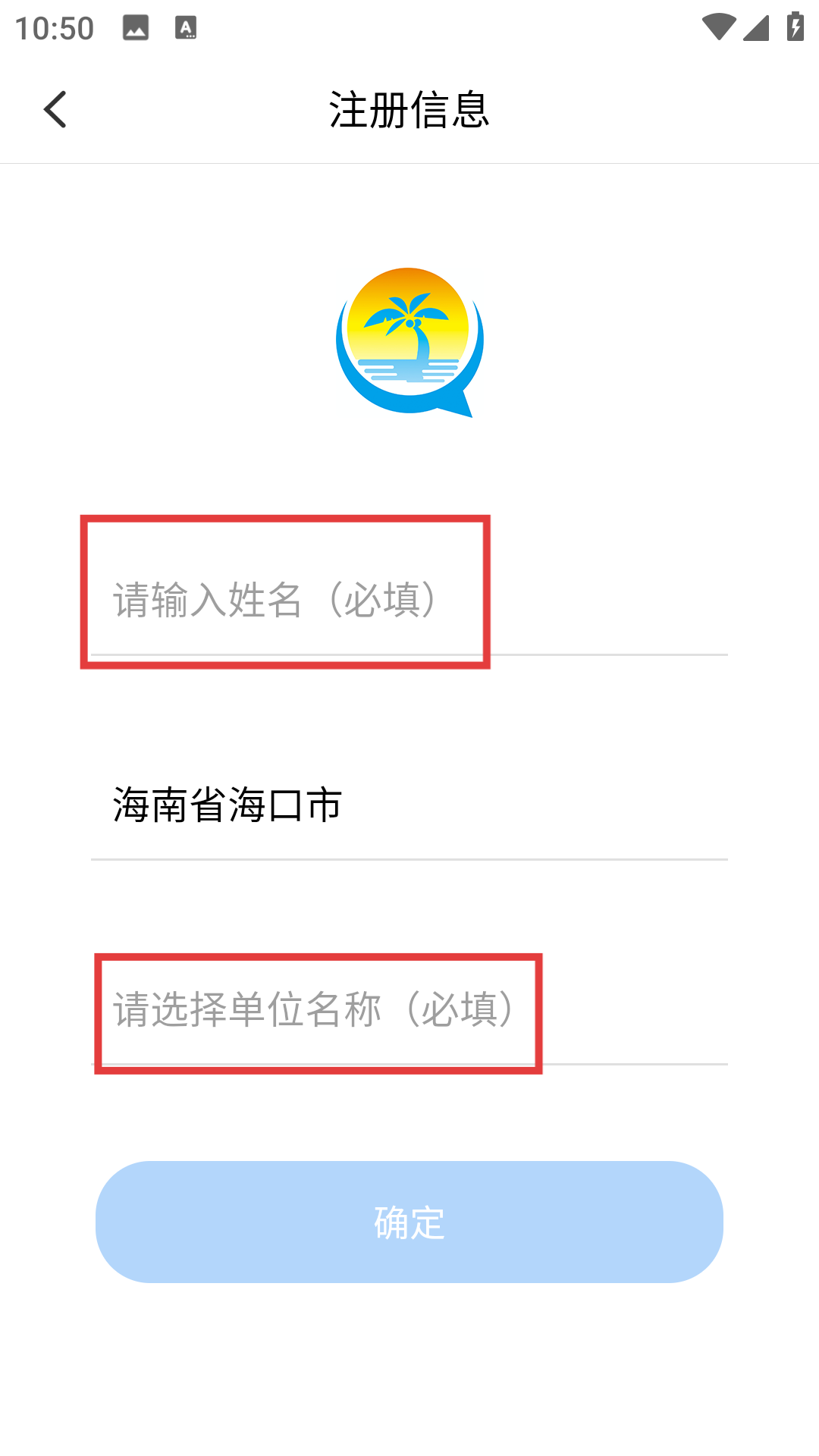 2、在【注册信息】页面输入【姓名】,选择【单位名称】。
