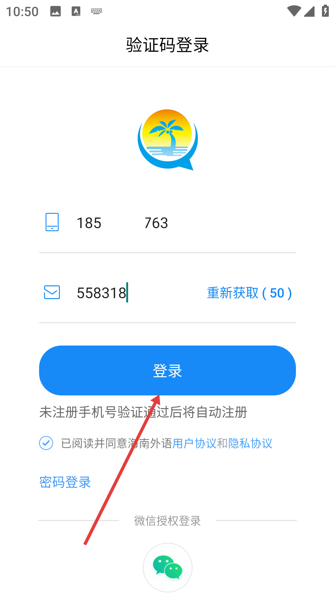 1、在【验证码登录】页面输入【注册手机号】和【短信验证码】,勾选协议后点击【登录】。