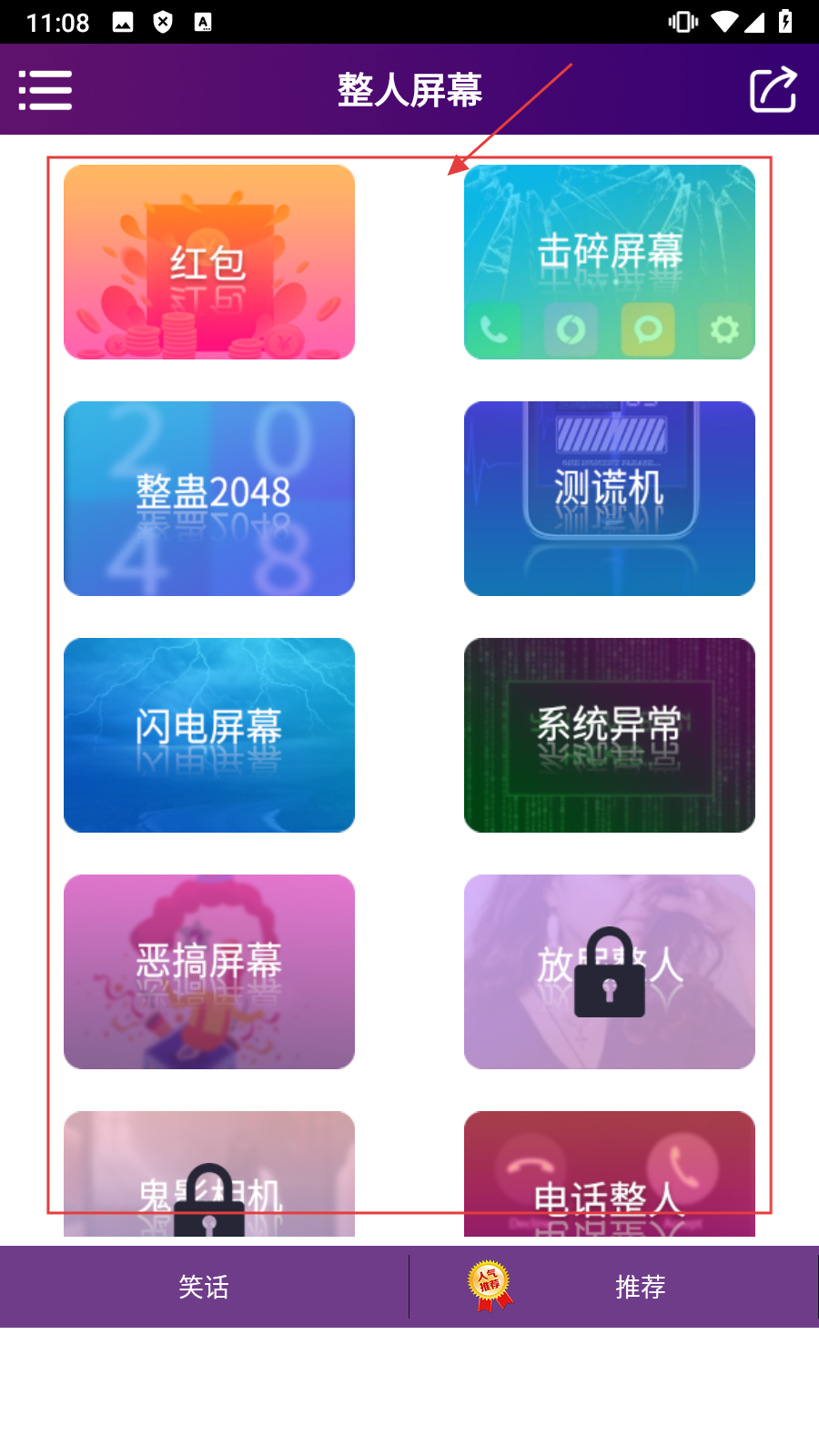 1、进入整人屏幕界面,可选择【红包、击碎屏幕等整人】功能,享受整蛊乐趣。