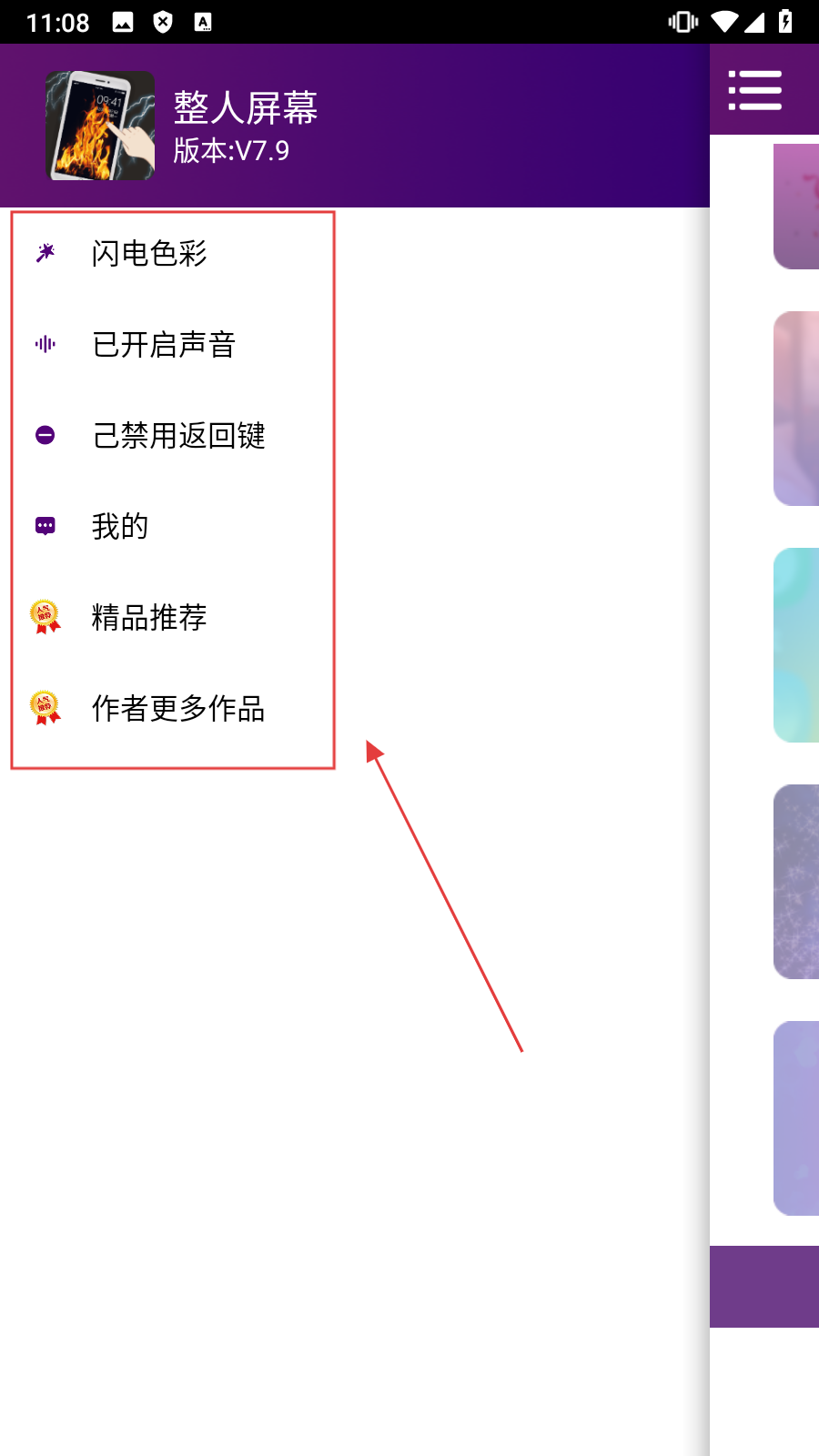 2、进入侧边栏界面,可【查看闪电色彩、已开启声音等设置】,管理应用功能设置。