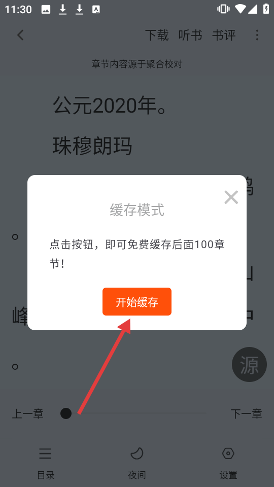 4、在弹出的缓存模式窗口中,点击【开始缓存】,即可缓存后续章节。