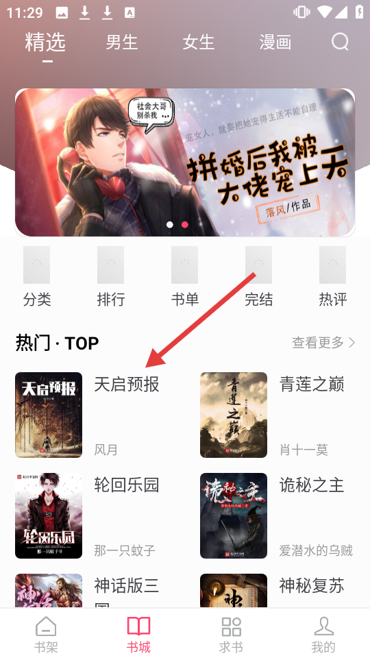 1、在书城热门TOP区域,点击《天启预报》进入书籍详情页。