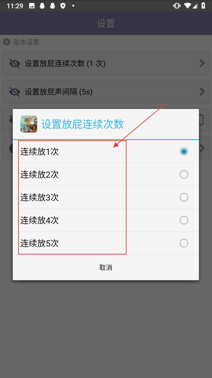 3、进入设置界面,可【设置放屁连续次数】,调整屁声连续播放设置。