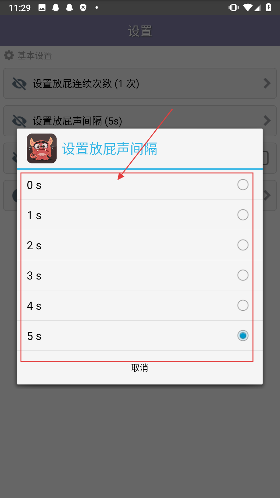 4、进入设置界面,可【设置放屁声间隔】,调整屁声播放间隔设置。