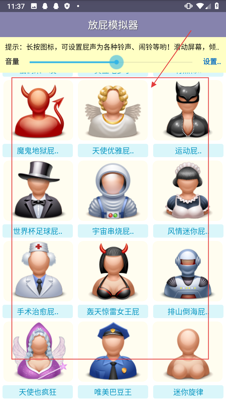 1、进入放屁模拟器界面,可选择【魔鬼地狱屁、天使优雅屁等多样】屁声类型,享受趣味屁声模拟体验。