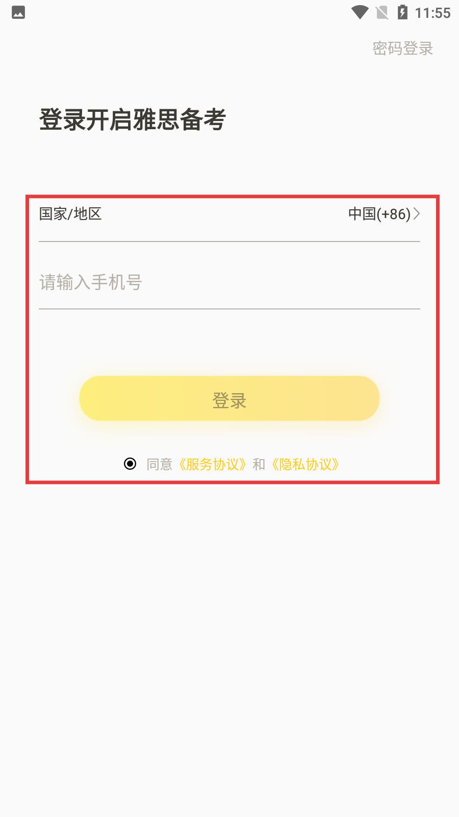 1、打开雅思写作APP,在温馨提示页面点击【同意】按钮,进入登录页面。