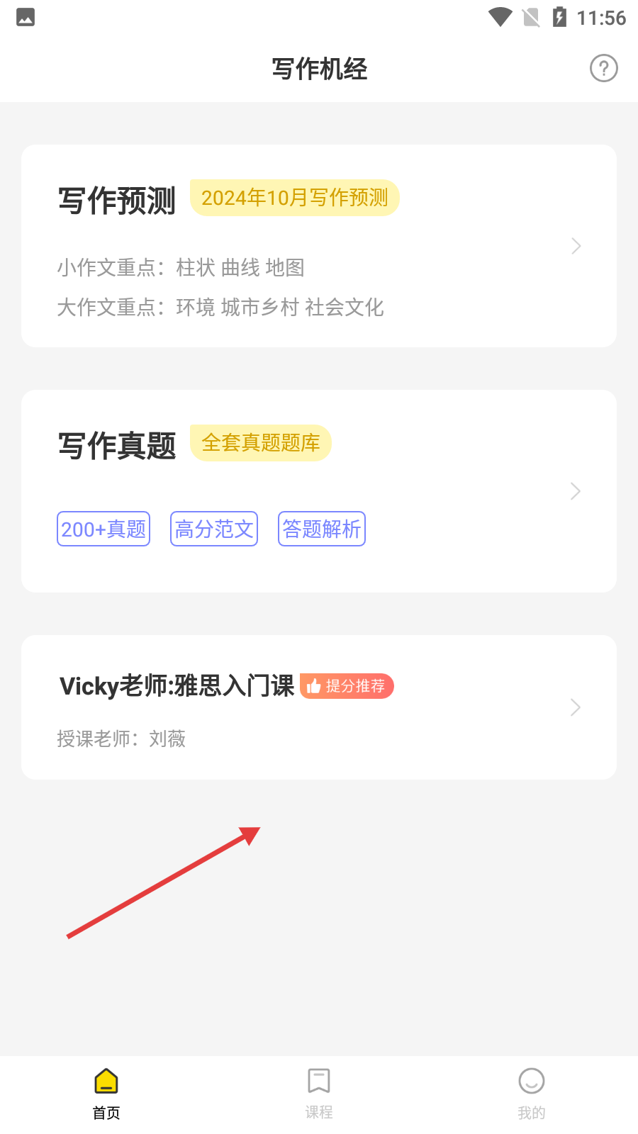 4、登录后进入首页,可查看写作预测、写作真题及相关课程,如Vicky老师的雅思入门课。