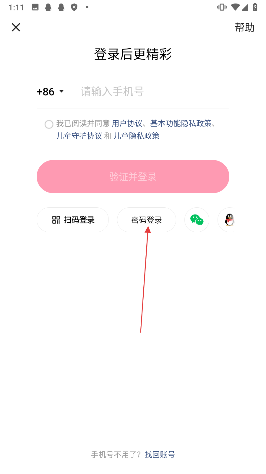 2、进入登录界面后,点击【密码登录】,进入密码登录界面。