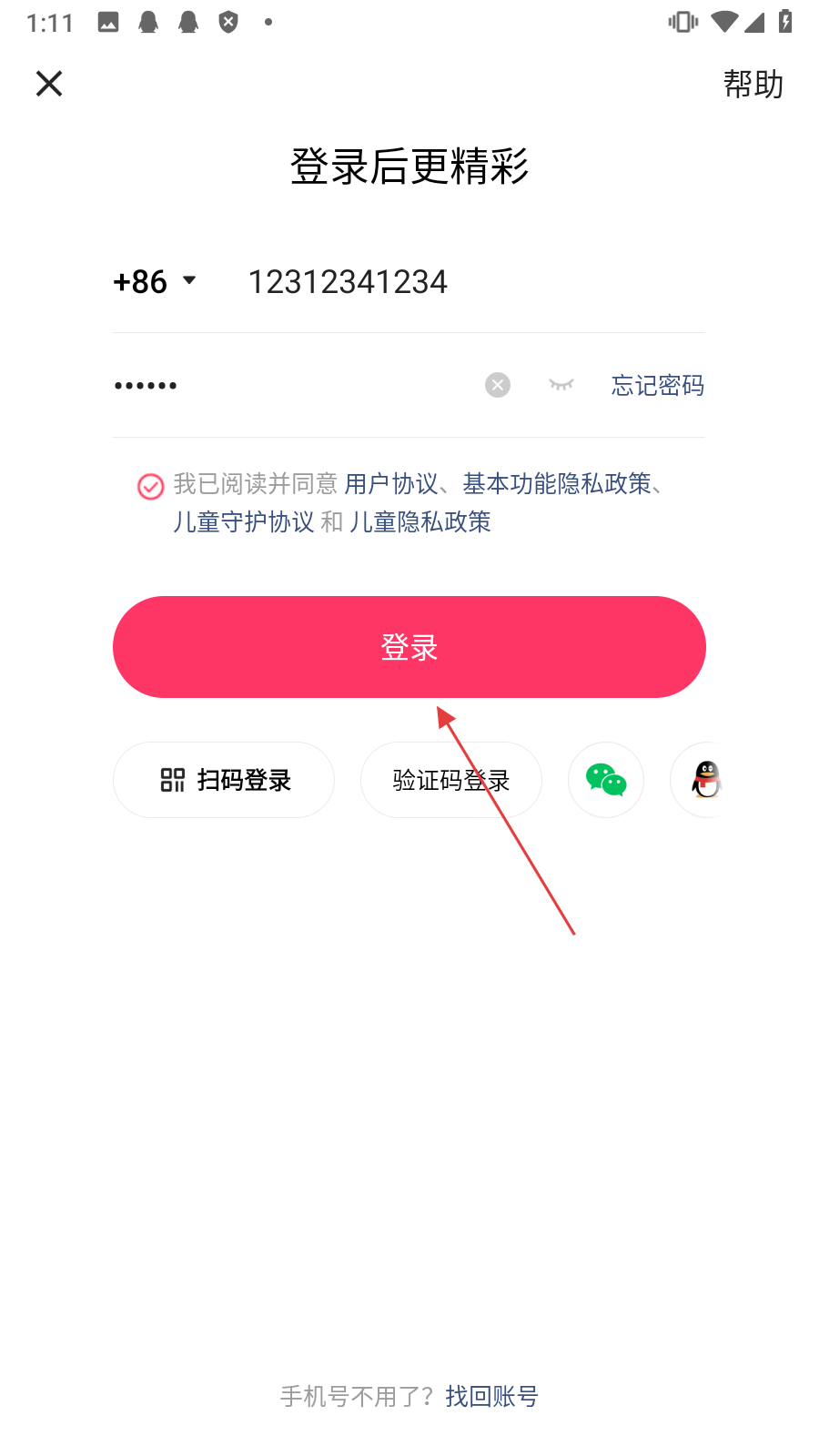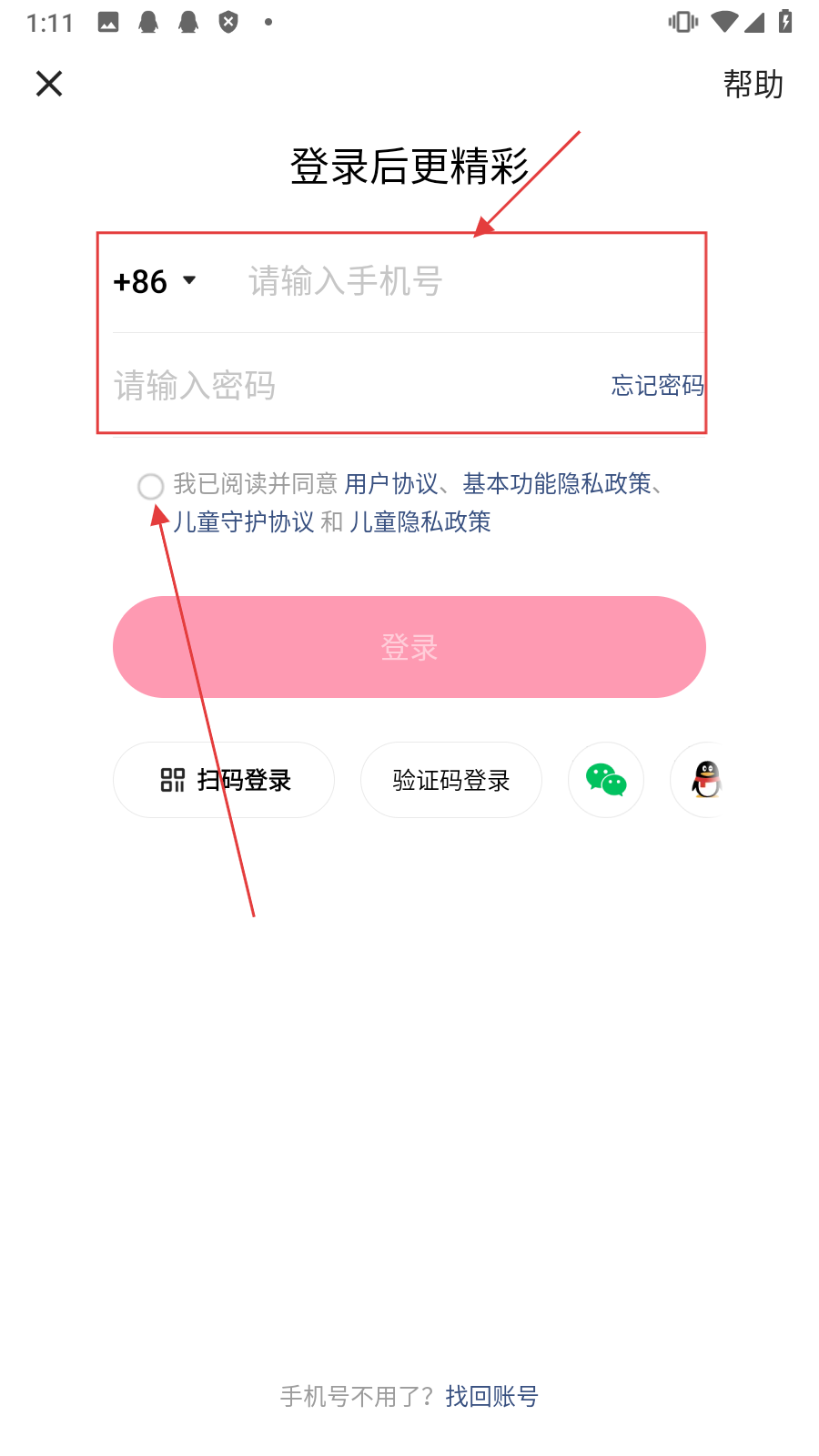 3、在密码登录界面,输入【请输入手机号和密码,勾选协议】。