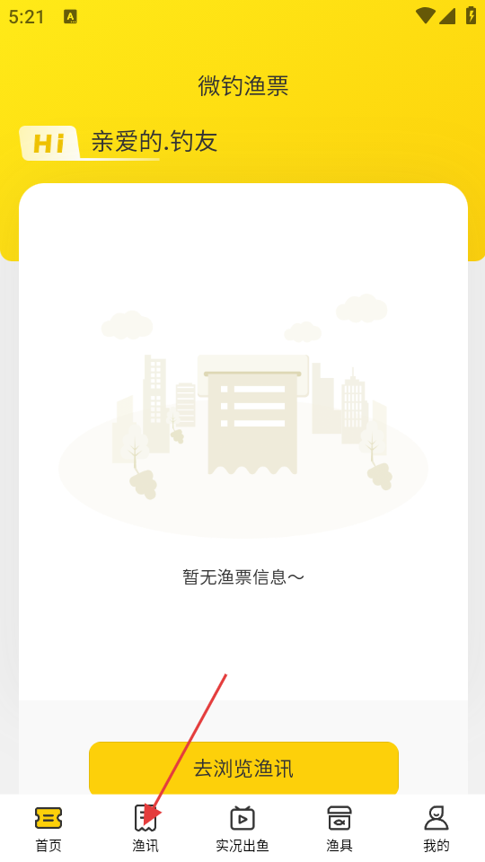 1、点击底部导航栏的【渔讯】按钮,进入渔讯板块查看渔票信息。