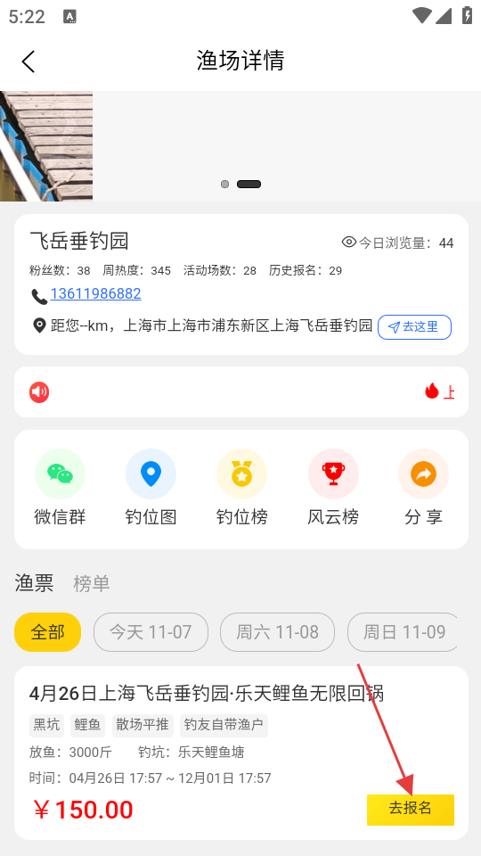 3、在渔场详情页面,点击【去报名】按钮,进入渔讯详情页面。