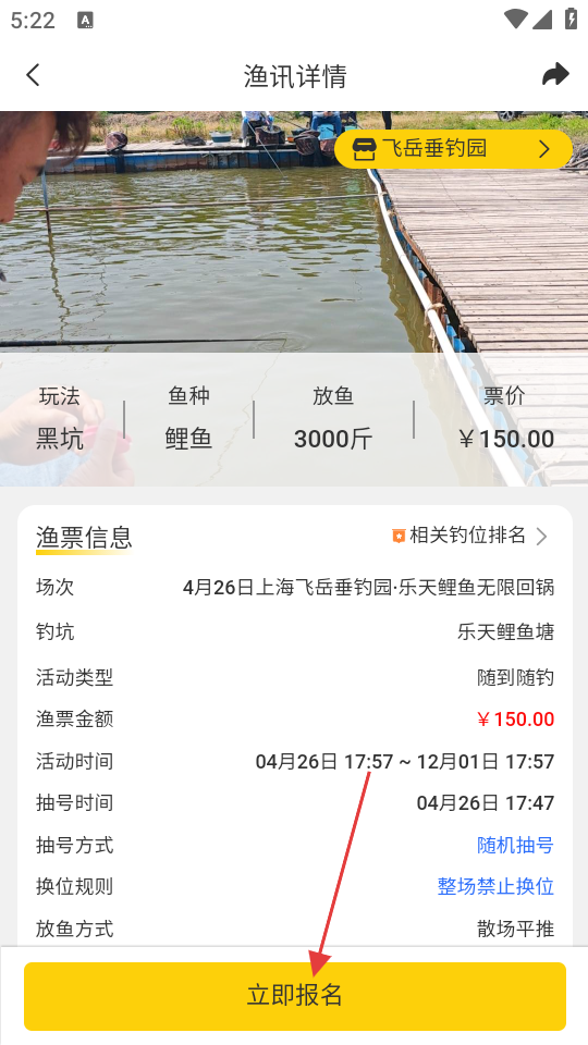 4、在渔讯详情页面,点击【立即报名】按钮,即可申请报名该渔场渔票活动。