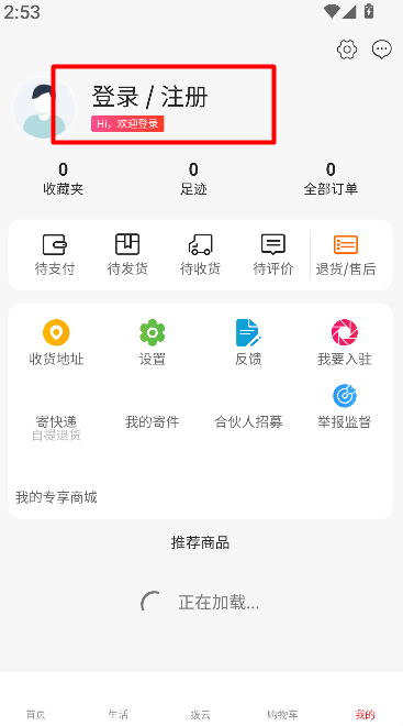1、打开软件后,在首页界面点击“注册登录”按钮进入账号管理页面。