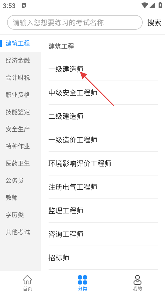 2、在考试分类页面,选择【一级建造师】考试类别,进入该考试的试题列表页面。