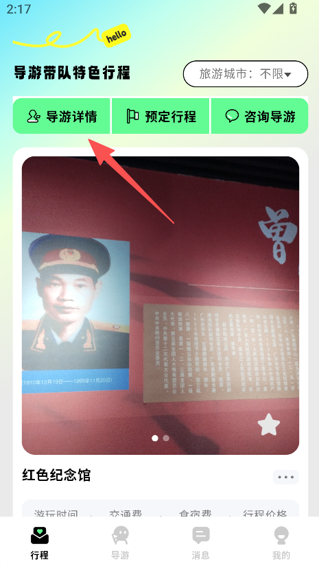 2、行程与导游信息结合,特色行程(红色纪念馆)与导游详情(等级、费用)层次分明,助力用户选择合适导游与行程。