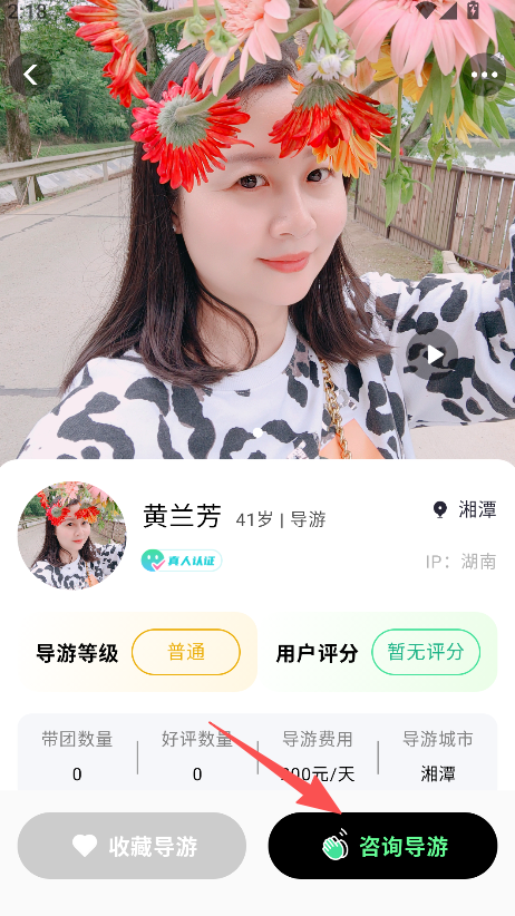 1、点击导游详情,查看导游信息(等级、带团数、费用)。