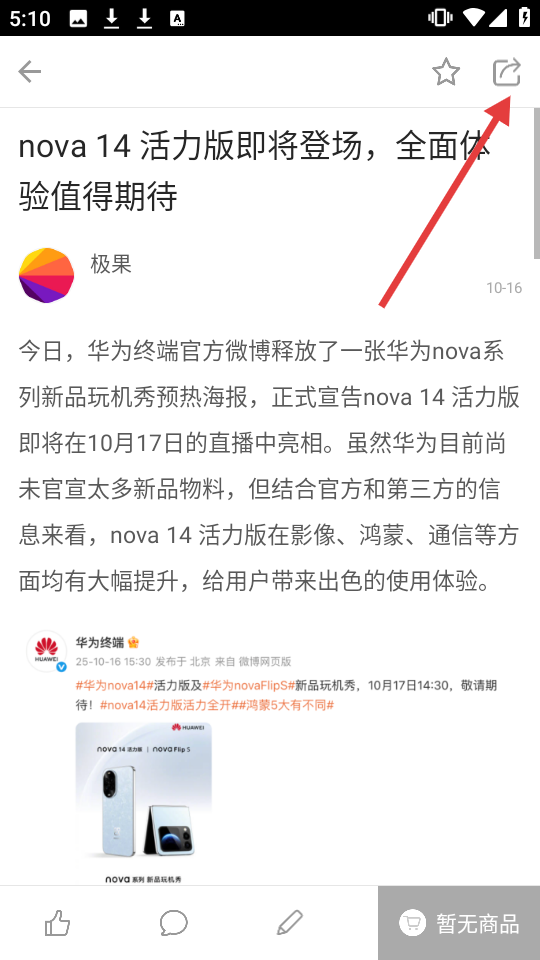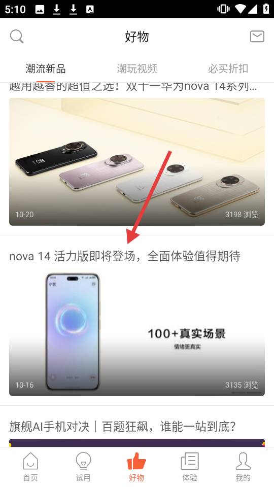 2、在好物页面,点击【nova14活力版即将登场,全面体验值得期待】,可进入该内容详情页。