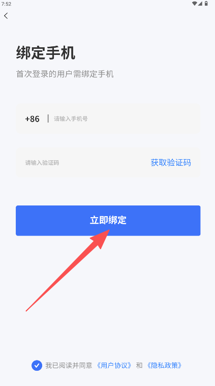 1、首次页面输入手机号与验证码,点击“立即绑定”完成。