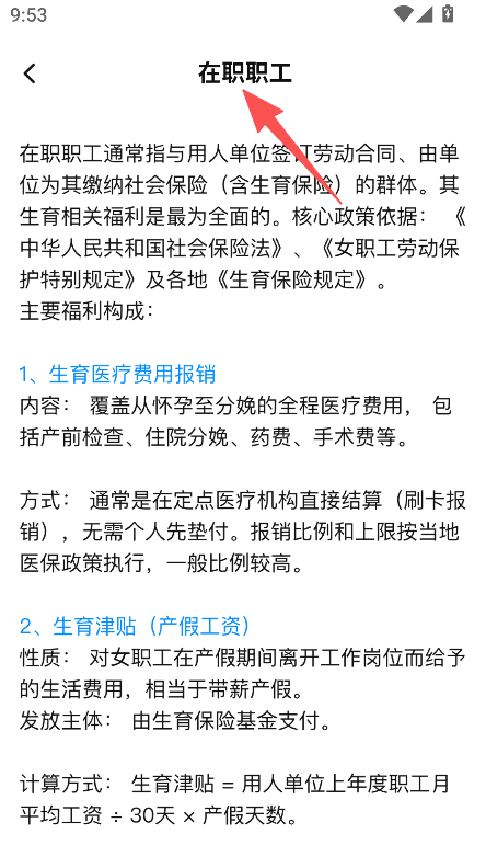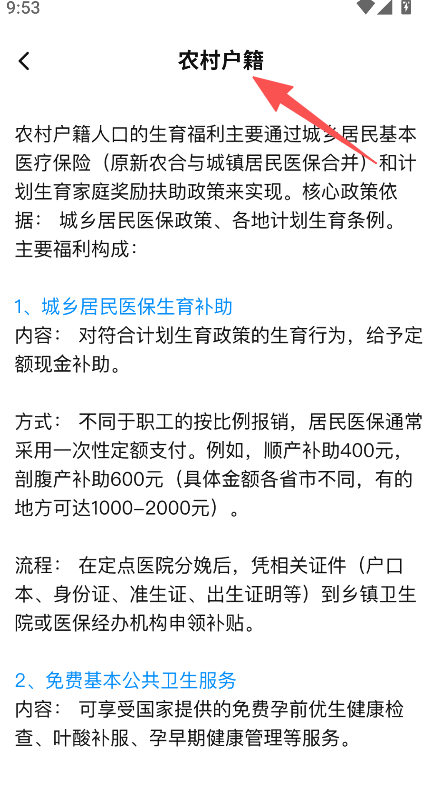 1、具备政策查询功能,解析在职职工、农村户籍的生育福利,用户深入了解生育权益,福利认知更扎实。