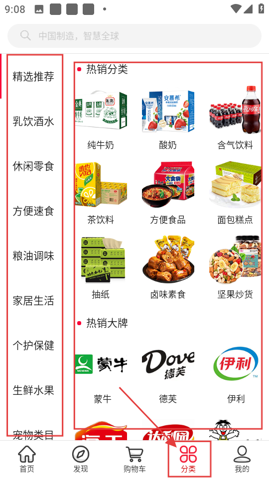 2、点击【分类】,可进入分类页面,查看精选推荐、热销分类等,方便查找商品哦。