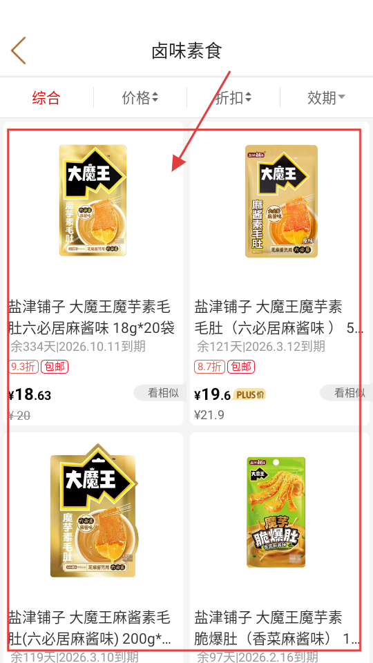 3、在分类页面选择卤味素食后,可浏览该分类下的商品,如盐津铺子大魔王魔芋素毛肚等,选择心仪商品啦。