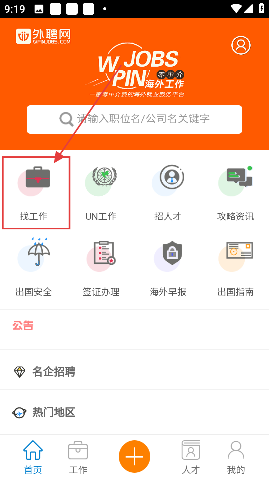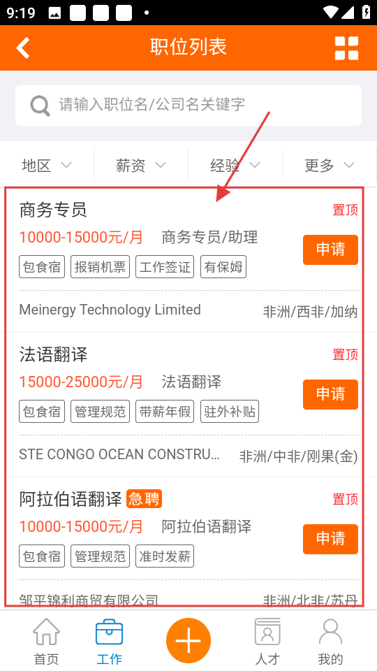 1、点击【找工作】,进入职位列表界面,可查看各类海外工作职位哦。