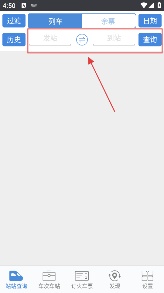 1、在发站-到站输入框填写行程地点,点击【查询】。