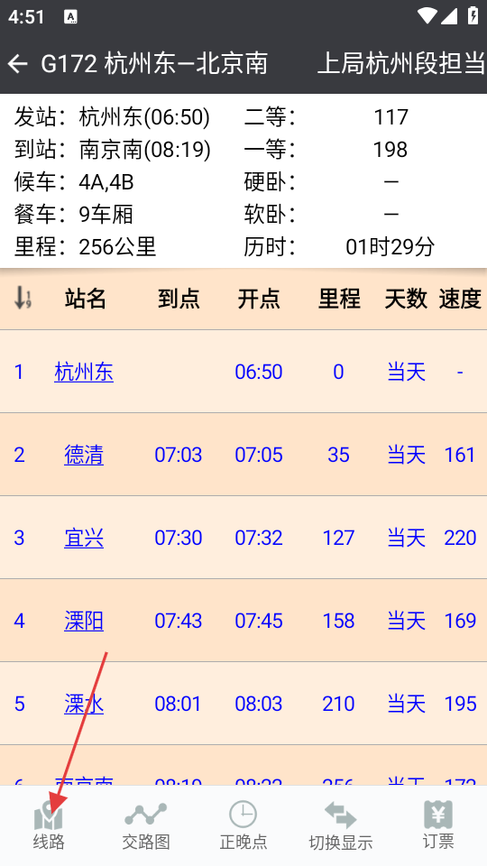 3、点击目标车次,查看发站-到站时间、候车室等信息,再点击【线路】。