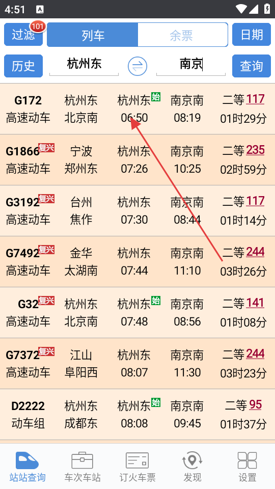 2、在列车列表中找到目标车次,如【G172】高速动车。