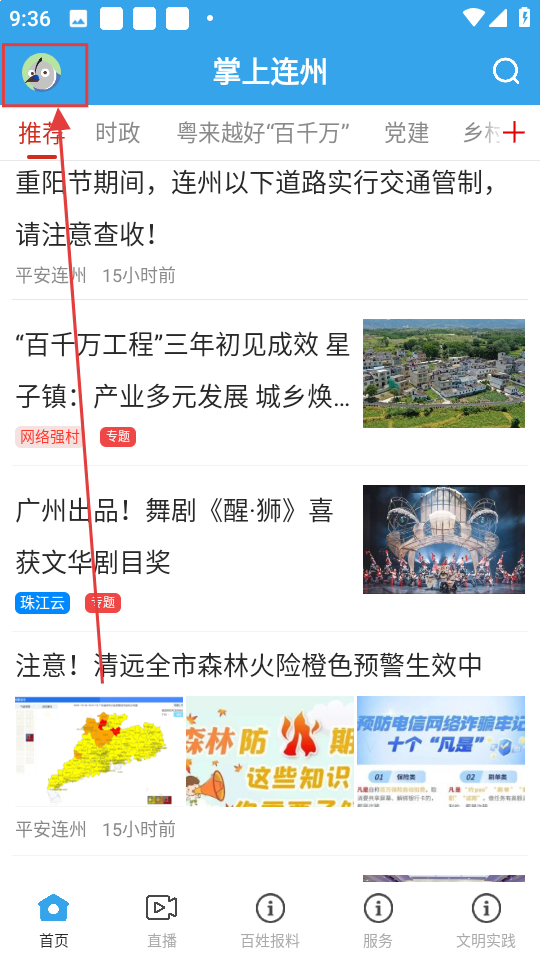 1、在掌上连州首页,点击左上角头像,可进入个人页面,准备进行账号相关操作啦。
