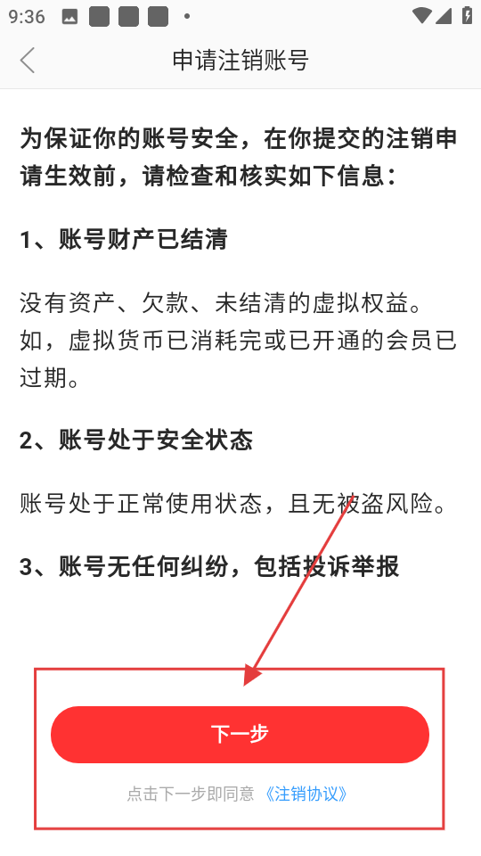 4、在申请注销账号页面,点击【下一步】,可按照提示完成账号注销操作哦。