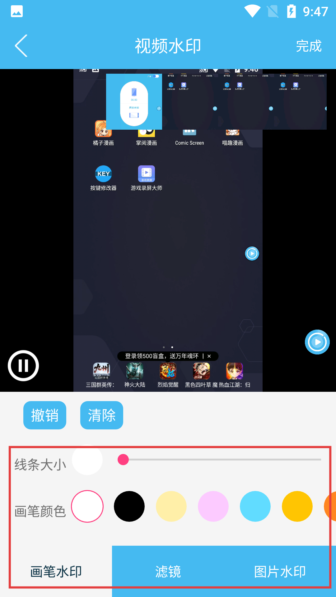 4、在【视频水印】编辑界面,可调整线条大小、选择画笔颜色,还可切换画笔水印等类型,编辑完成后点击【完成】即可。
