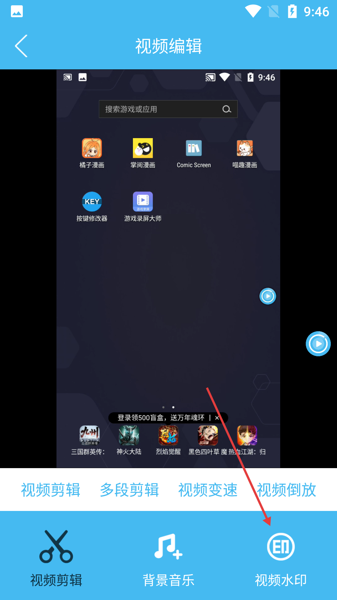 1、在【视频编辑】界面,点击【视频水印】选项,可开启视频水印编辑流程。