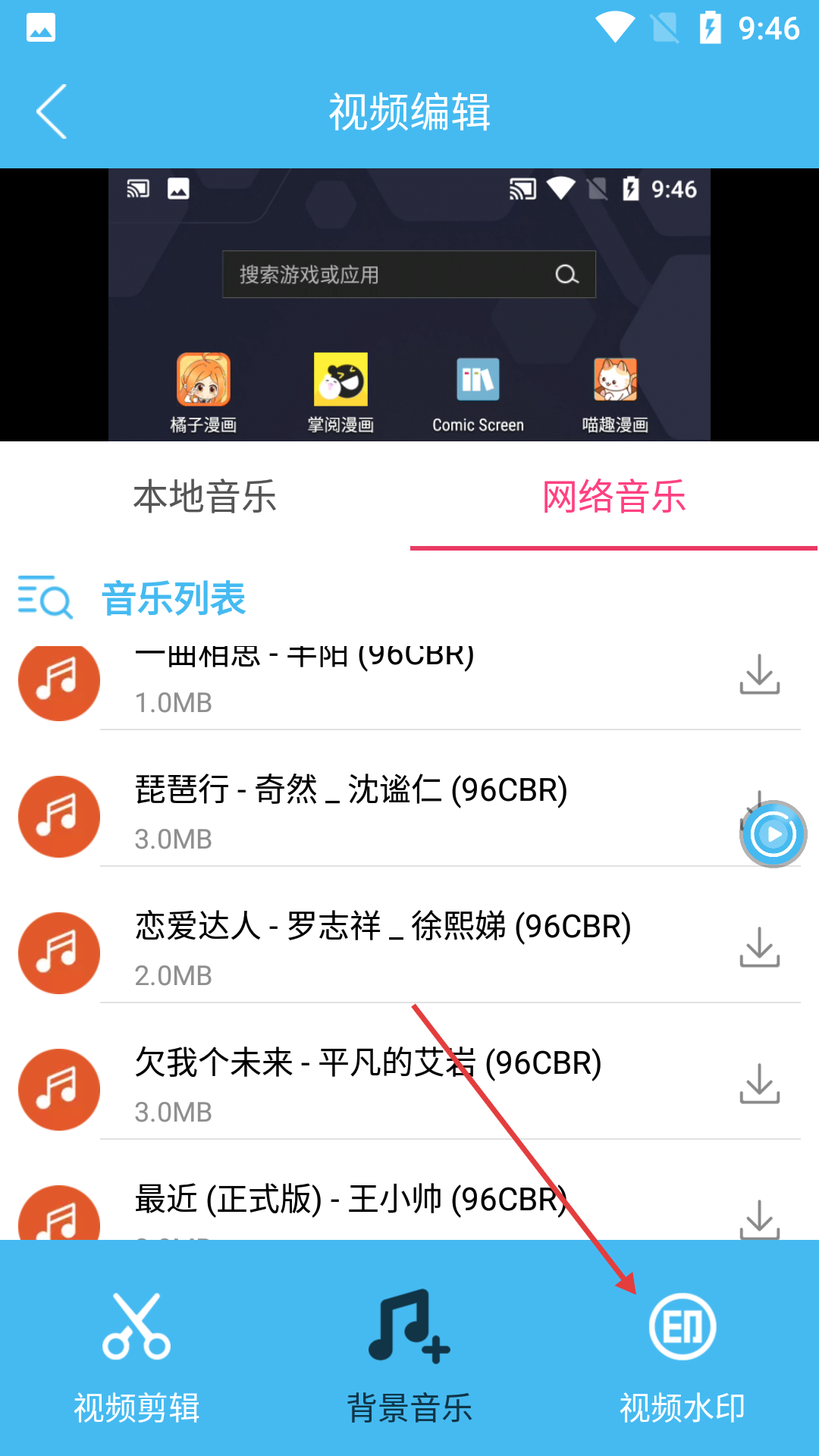 2、在【视频编辑】的背景音乐选择界面,点击【视频水印】选项,可进入水印设置环节。
